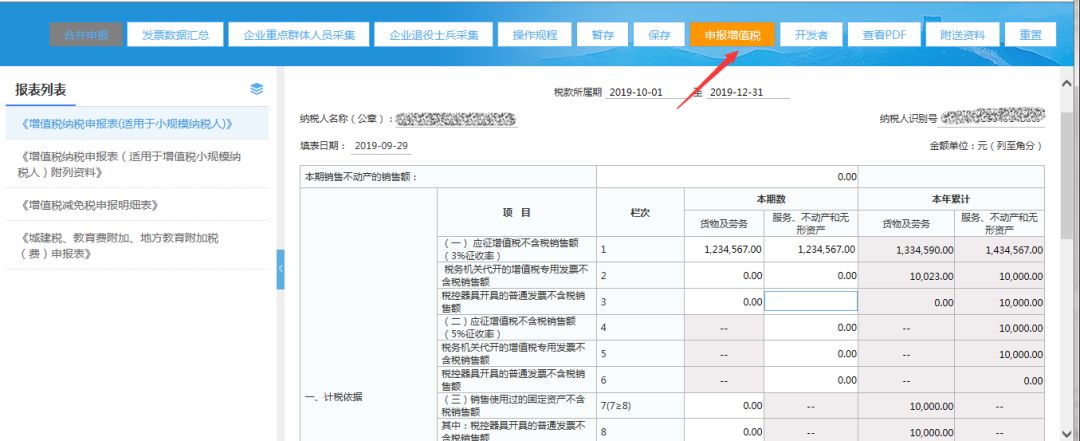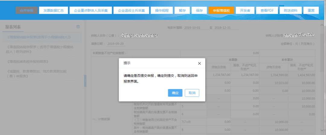 3)填寫完整增值稅小規(guī)模申報表后,點擊【申報增值稅】按鈕,系統(tǒng)僅提交增值稅申報;