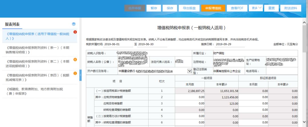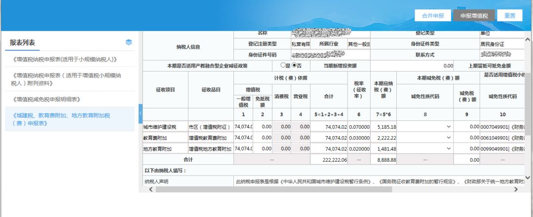 5)檢查附加稅數(shù)據(jù),填寫完成相關(guān)數(shù)據(jù)項后,點擊【合并申報】按鈕,進行合并申報;