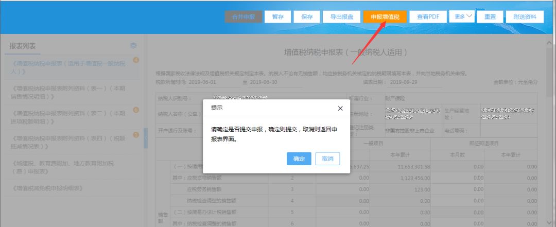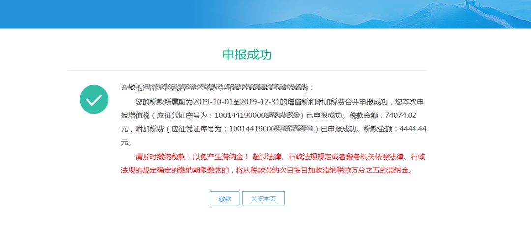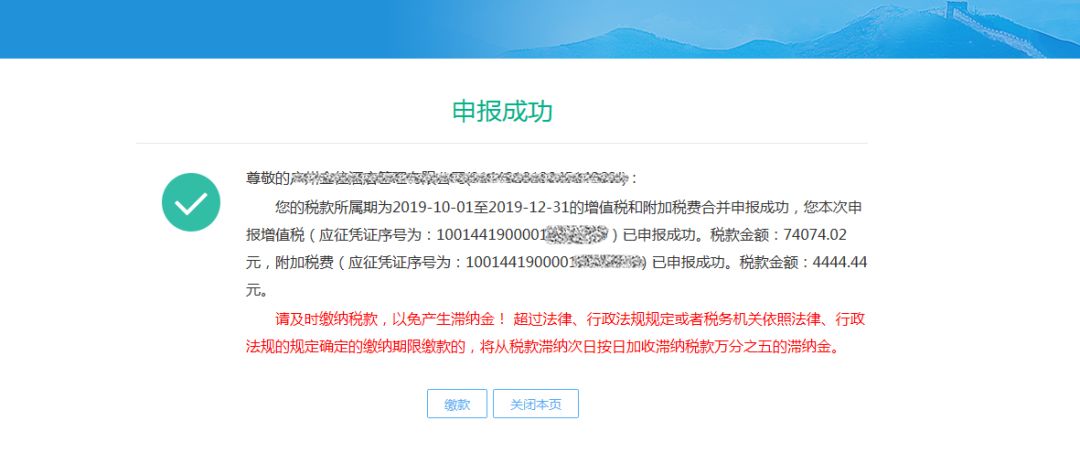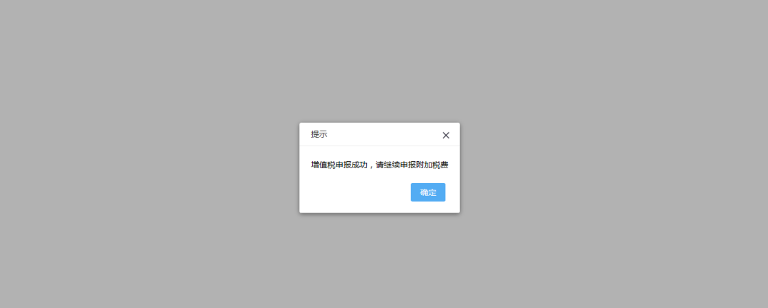 5)增值稅申報成功后,系統(tǒng)返回增值稅申報成功,點擊【確定】按鈕可進行附加稅申報;