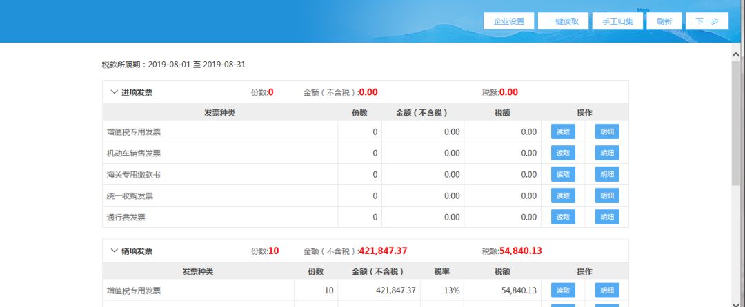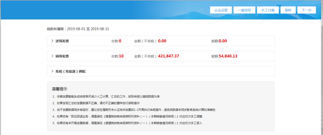 (2)進入發(fā)票匯總界面后,系統(tǒng)自動獲取當(dāng)期所有的進銷項發(fā)票數(shù)據(jù);