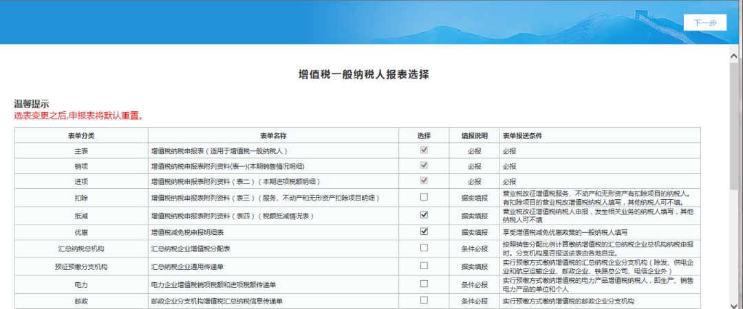 3)發(fā)票匯總界面點擊下一步按鈕,系統(tǒng)進入增值稅一般納稅人選表設(shè)置界面,企業(yè)根據(jù)自己實際業(yè)務(wù)發(fā)生情況勾選需報送的申報表,勾選完成點擊下一步進入增值稅納稅申報表,如下圖: