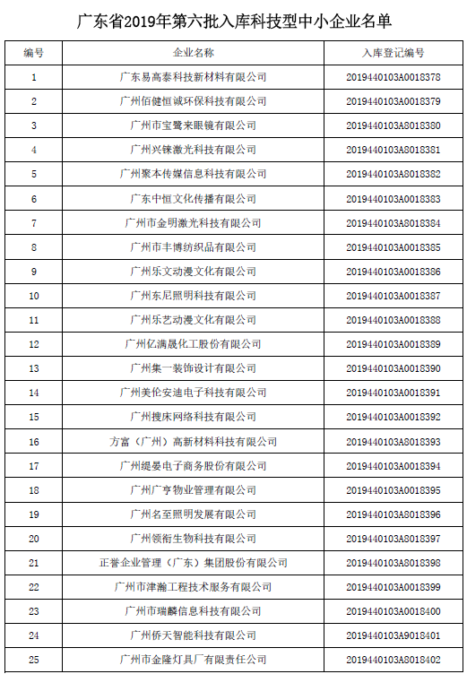 廣東省科學技術(shù)廳關(guān)于2019年第六批入庫科技型中小企業(yè)的公告