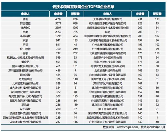 云技術專利排名:騰訊、阿里巴巴、奇虎360位居前三位