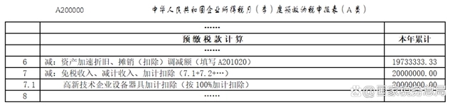 第二步:在《中華人民共和國(guó)企業(yè)所得稅月(季)度預(yù)繳納稅申報(bào)表(A類)》(A200000)第7行“減:免稅收入、減計(jì)收入、加計(jì)扣除”下的明細(xì)行次填報(bào)加計(jì)扣除情況。手工申報(bào)的,在明細(xì)行次填寫“高新技術(shù)企業(yè)設(shè)備、器具加計(jì)扣除(按100%加計(jì)扣除)”事項(xiàng)及加計(jì)扣除金額。通過電子稅務(wù)局申報(bào)的,申報(bào)系統(tǒng)自動(dòng)填報(bào)相關(guān)事項(xiàng)及加計(jì)扣除金額。